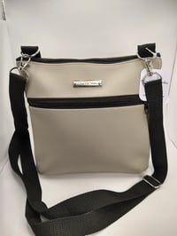 Approximately 9 X9 inches. Vinyl outer with grey waterproof canvas lining. One outer pocket and one inside pocket.